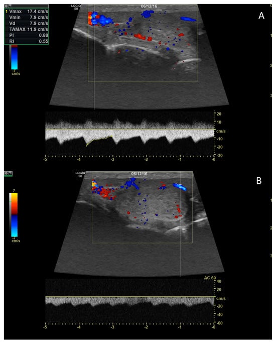 In dogs with torsion of the spermatic cord, colour Doppler ultrasound can help in identifying the absence of perfusion to and within the twisted testis [,], aiding in the differential diagnosis of acute orchitis []. In cases of incomplete torsion, it may be possible to observe decreased perfusion rather than complete absence [].