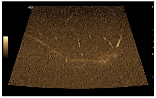 B-Flow is a type of digitally encoded ultrasound technology developed specifically by GE Healthcare (Chicago, IL, USA) for visualizing blood flow []. This technology is based on a combination of coded excitation and tissue equalization [], allowing for the direct visualization of moving blood echoes using a grey-scale presentation that demonstrates real-time blood movement, similar to a conventional angiogram (Figure 9), along with simultaneous visualization of the surrounding anatomy [].
