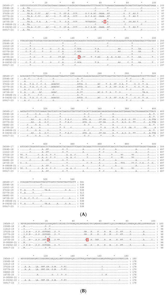 Alignment of the sequences obtained in this study. (A) Nucleotide sequences alignment; (B) deduced amino acid sequences alignment. Unique mutations observed in sequence 16735-20, when compared with all the sequences present in the phylogenetic tree, are heightened by a red square in both alignments.
