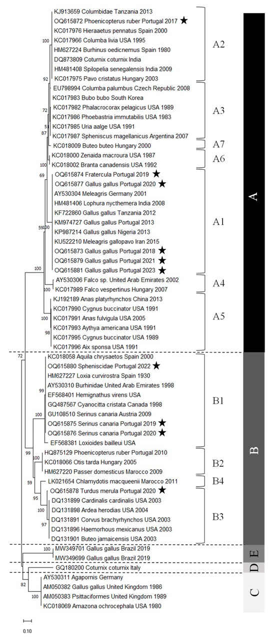 The phylogenetic analysis shows that the samples from Portugal are well distributed, with five samples belonging to subclade A1, one to subclade A2, three to subclade B1, and one to subclade B3. Moreover, their distribution is quite consistent with the nomenclature given since samples from Gallus gallus belong to the fowlpox clade (clade A), whereas samples from Turdus merula and Serinus canaria, both Passeriformes, belong to the canarypox clade (clade B). Phoenicopterus ruber, Fratercula, and Spheniscidae are neither fowl nor Passeriforme’s representatives. The viruses detected in the first two hosts belong to the fowlpox clade, whereas the penguinpox virus belongs to the canarypox clade.