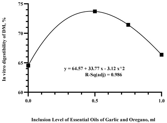 A polynomial regression analysis was performed, and it was determined that increasing levels of EOs conferred a quadratic effect (p < 0.046 and R-Sq(adj) of 0.986) on the IVDMD (Figure 2). Based on the regression equation, inclusion levels of 0.5, 0.75, and 1 mL/day were selected for the in vivo digestibility study.