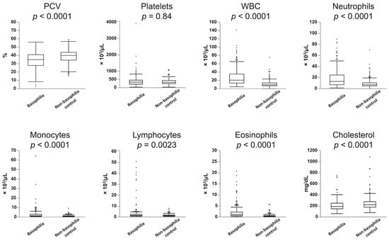 Automated CBC analyses were performed using the ADVIA 120 Hematology System (Siemens, Munich, Germany). For each automated CBC, a manual differential white blood cell (WBC) count was also performed. We retrieved specific CBC data, including spun packed cell volume (PCV), platelet count, WBC count, and counts of neutrophils, lymphocytes, monocytes, and eosinophils, from the medical records. When available, automated and/or manual reticulocyte count data were collected for anemic dogs. An absolute reticulocyte count >93,730/UL was defined as regenerative anemia. In addition, we investigated the possible connection between elevated blood cholesterol levels and basophilia in dogs, following anecdotal evidence suggesting a link between hyperlipidemia and basophilia []. Cholesterol values were retrieved from medical records if a concurrent chemistry panel had been performed within a few days of the CBC analysis. Cholesterol values were performed using the Cobas 6000 (Roche Diagnostics, Basel, Switzerland). To compare the basophilia group with the non-basophilia control group, we assessed factors such as cholesterol levels and hematologic abnormalities, including anemia, erythrocytosis, thrombocytosis, thrombocytopenia, leukocytosis, neutrophilia, neutropenia, eosinophilia, monocytosis, and lymphocytosis.