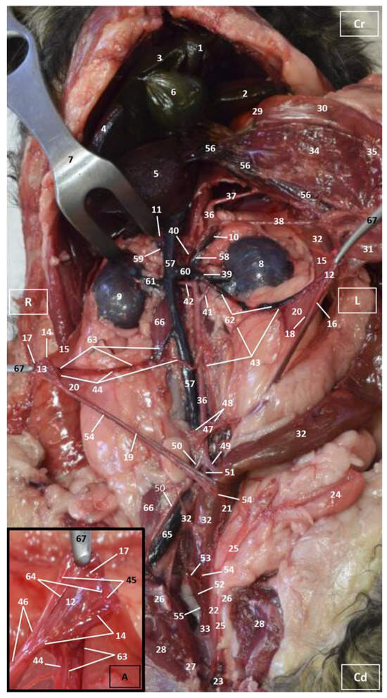 Deep anatomical dissection of the abdominal and pelvic cavities of the cat. Ventral view. The small and large intestine and right lobe of the pancreas has been displaced to the left. The right hepatic lobes have been displaced cranially using a surgical abdominal separator to observe the vascularization of the abdominal roof. The ovaries have been clamped from the mesovarium in order to clearly observe the irrigation of the right and left uterine horns. The arteries and veins have been injected with red and blue latex, respectively. (A) Detail of the ovarian irrigation. L = Left; R = Right; Cr = Cranial; Cd = Caudal. 1. Liver: left medial lobe; 2. Liver: left lateral lobe; 3. Liver: quadrate lobe; 4. Liver: right medial lobe; 5. Liver: right lateral lobe; 6. Gallbladder; 7. Abdominal surgery retractor; 8. Left kidney; 9. Right kidney; 10. Left adrenal gland; 11. Right adrenal gland; 12. Left ovary; 13. Right ovary; 14. Right uterine tube; 15. Mesovarium: suspensory ligament; 16. Mesovarium: proper ligament of the ovary; 17. Mesosalpinx; 18. Left uterine horn; 19. Right uterine horn; 20. Broad ligament: mesometrium; 21. Uterus: body; 22. Vagina; 23. Vagina: vestibule; 24. Urinary bladder; 25. Female urethra; 26. Pubis (sectioned); 27. Ischium (sectioned); 28. Musculature of the thigh (sectioned); 29. Duodenum: cranial part; 30. Duodenum: descending part; 31. Duodenum: ascending part; 32. Descending colon; 33. Rectum; 34. Pancreas: right lobe; 35. Mesoduodenum; 36. Abdominal aorta; 37. Celiac artery; 38. Cranial mesenteric artery; 39. Left caudal adrenal artery; 40. Right middle adrenal artery; 41. Left renal artery; 42. Right renal artery; 43. Left ovarian artery; 44. Right ovarian artery; 45. Right ovarian artery: tubal branch; 46. Right ovarian artery: uterine branch; 47. Caudal mesenteric artery; 48. Right and left deep circumflex iliac arteries; 49. Left external iliac artery; 50. Right external iliac artery; 51. Abdominal aorta: final stretch; 52. Right internal pudendal artery; 53. Right vaginal artery; 54. Right uterine artery; 55. Right middle rectal artery; 56. Portal vein; 57. Caudal vena cava; 58. Left adrenal vein; 59. Right adrenal vein; 60. Left renal vein; 61. Right renal vein; 62. Left ovarian vein; 63. Right ovarian vein; 64. Right ovarian vein: ovarian plexus; 65. Right common iliac vein; 66. Psoas major muscle; and 67. Hemostatic forceps.