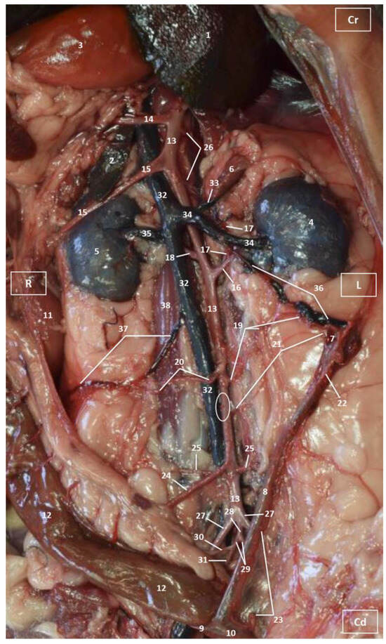 Deep anatomical dissection plane of the abdominal cavity of the cat. Ventral view. The small and large intestine have been displaced to the right. The arteries have been filled with red latex and the veins are blue. L = Left; R = Right; Cr = Cranial; Cd = Caudal. 1. Liver: left lateral lobe; 2. Liver: right lateral lobe; 3. Stomach; 4. Left kidney; 5. Right kidney; 6. Left adrenal gland; 7. Left ovary; 8. Left uterine horn; 9. Right uterine horn; 10. Uterus: body; 11. Duodenum: ascending portion; 12. Descending colon; 13. Abdominal aorta; 14. Celiac artery; 15. Cranial mesenteric artery; 16. Left renal artery; 17. Left caudal adrenal artery; 18. Right renal artery; 19. Left ovarian artery; 20. Right ovarian artery; 21. Left accessory ovarian artery; 22. Right ovarian artery: uterine branch; 23. Left uterine artery; 24. Caudal mesenteric artery; 25. Right and left deep circumflex iliac arteries; 26. Lumbar arteries; 27. Left and right external iliac arteries; 28. Abdominal aorta: final portion; 29. Left and right internal iliac arteries; 30. Caudal gluteal artery; 31. Right internal pudendal artery; 32. Caudal vena cava; 33. Left adrenal vein; 34. Left renal vein; 35. Right renal vein; 36. Left ovarian vein; 37. Right ovarian vein; 38. Psoas major muscle; and ellipse: a small sketch of the start of the obliterated right accessory ovarian artery.
