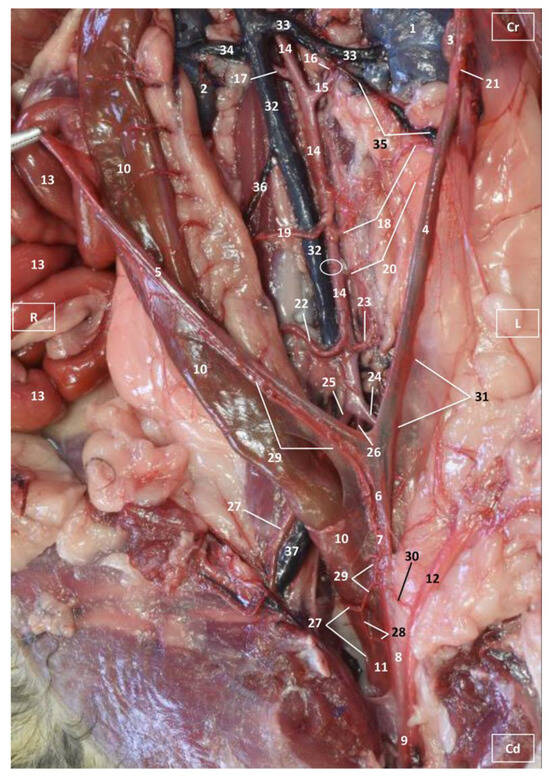 Deep anatomical dissection of the abdominal and pelvic cavities of the cat. Detail of the uterine irrigation. Left side view. The small and large intestine have been displaced to the right. The arteries have been filled with red latex and the veins are blue. L = Left; R = Right; Cr = Cranial; Cd = Caudal. 1. Left kidney; 2. right kidney; 3. left ovary; 4. left uterine horn; 5. right uterine horn; 6. uterus: body; 7. uterus: neck; 8. vagina; 9. vagina: vestibule; 10. descending colon; 11. rectum; 12. female urethra; 13. jejunum: loops; 14. abdominal aorta; 15. left renal artery; 16. left caudal adrenal artery; 17. right renal artery; 18. left ovarian artery; 19. right ovarian artery; 20. accessory ovarian artery; 21. right ovarian artery: uterine branch; 22. caudal mesenteric artery; 23. left deep circumflex iliac artery; 24. left external iliac artery; 25. right external iliac artery; 26. abdominal aorta: final stretch; 27. right middle rectal artery; 28. right vaginal artery; 29. right uterine artery; 30. urethral artery; 31. left uterine artery; 32. caudal vena cava; 33. left renal vein; 34. right renal vein; 35. left ovarian vein; 36. right ovarian vein; 37. common iliac vein; and ellipse: a small portion of the start of the obliterated right accessory ovarian artery.