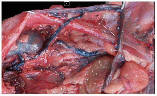 We observed how the caudal vena cava is located parallel to the abdominal aorta. Conveying venous blood from the pelvic limb and the pelvic cavity, we could appreciate the right common iliac vein entering the caudal vena cava. Arriving from the ovaries, the right ovarian vein flowed directly into the caudal vena cava, while the left ovarian vein drained into the left renal vein. We also identified the right adrenal vein draining into the caudal vena cava; however, the left adrenal vein emptied into the left renal vein. Both renal veins entered the caudal vena cava. In addition, we were able to observe the portal vein coursing towards the porta hepatis (Figure 1, Figure 2, Figure 3 and Figure 4). Finally, we saw the ovarian venous plexus filled with colored blue latex, as well as the uterine veins that appeared dilated and surrounded by the uterine artery (Figure 4).