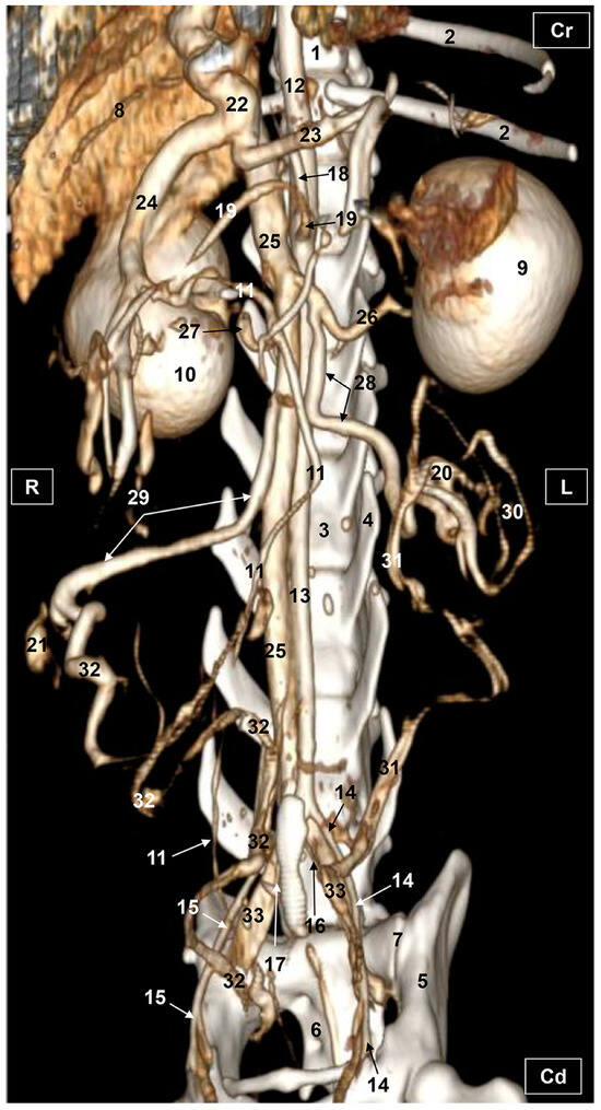 Three-dimensional reconstruction image of the abdominal and pelvic arterial and venous system in a female feline. Radiant VR. Ventral view. R = Right. L = Left. Cr = Cranial. Cd = Caudal. 1. Thoracic vertebra; 2. ribs; 3. lumbar vertebra; 4. costiform process; 5. ilium bone: wing; 6. sacrum: ventral face; 7. sacroiliac joint; 8. liver (sectioned); 9. left kidney; 10. right kidney; 11. right ureter; 12. descending aorta: thoracic aorta; 13. abdominal aorta; 14. left external iliac artery; 15. right external iliac artery; 16. left internal iliac artery; 17. right internal iliac artery; 18. celiac artery; 19. cranial mesenteric artery; 20. left ovary; 21. right ovary 22. portal vein; 23. splenic vein; 24. cranial mesenteric vein; 25. caudal vena cava; 26. left renal vein; 27. right renal vein; 28. left ovarian vein; 29. right ovarian vein; 30. ovarian vein: ovarian plexus; 31. left uterine artery and vein; 32. right uterine vein; and 33. left and right common iliac vein.