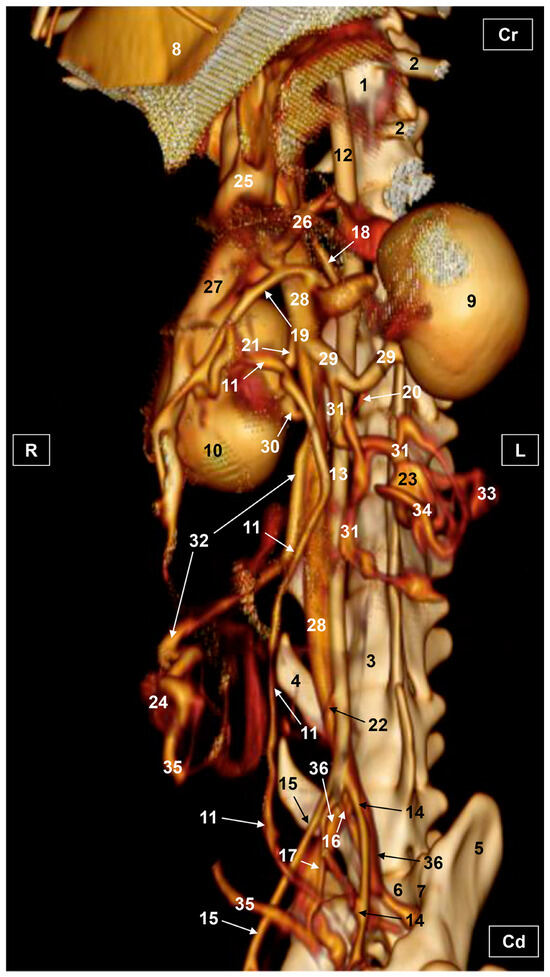 Three-dimensional reconstruction image of the abdominal and pelvic arterial and venous system in a female feline. OsiriX volumen rendering. Ventral view. R = Right. L = Left. Cr = Cranial. Cd = Caudal. 1. Thoracic vertebra; 2. ribs; 3. lumbar vertebra; 4. costiform process; 5. ilium bone: wing; 6. sacrum: ventral face; 7. sacroiliac joint; 8. liver (sectioned); 9. left kidney; 10. right kidney; 11. right ureter; 12. descending aorta: thoracic aorta; 13. abdominal aorta; 14. left external iliac artery; 15. right external iliac artery; 16. left internal iliac artery; 17. right internal iliac artery; 18. celiac artery; 19. cranial mesenteric artery; 20. left renal artery; 21. right renal artery; 22. caudal mesenteric artery; 23. left ovary; 24. right ovary 25. portal vein; 26. splenic vein; 27. cranial mesenteric vein; 28. caudal vena cava; 29. left renal vein; 30. right renal vein; 31. left ovarian vein; 32. right ovarian vein; 33. ovarian vein: ovarian plexus; 34. left uterine artery and vein; 35. right uterine artery and vein; and 36. left and right common iliac vein.