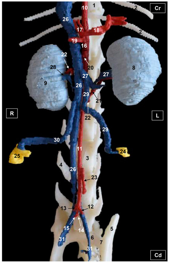 Three-dimensional reconstruction image of the abdominal and pelvic arterial and venous system in a female feline. 3D printing. Ventral view. R = Right. L = Left. Cr = Cranial. Cd = Caudal. 1. Thoracic vertebra; 2. ribs; 3. lumbar vertebra; 4. costiform process; 5. ilium bone: wing; 6. sacrum: ventral face; 7. sacroiliac joint; 8. left kidney; 9. right kidney; 10. descending aorta: thoracic aorta; 11. abdominal aorta; 12. left external iliac artery; 13. right external iliac artery; 14. left internal iliac artery; 15. right internal iliac artery; 16. celiac artery; 17. hepatic artery; 18. splenic artery; 19. left gastric artery; 20. cranial mesenteric artery; 21. left renal artery; 22. right renal artery; 23. caudal mesenteric artery; 24. left ovary; 25. right ovary; 26. caudal vena cava; 27. left renal vein; 28. right renal vein; 29. left ovarian vein; 30. right ovarian vein; and 31. left and right common iliac veins.