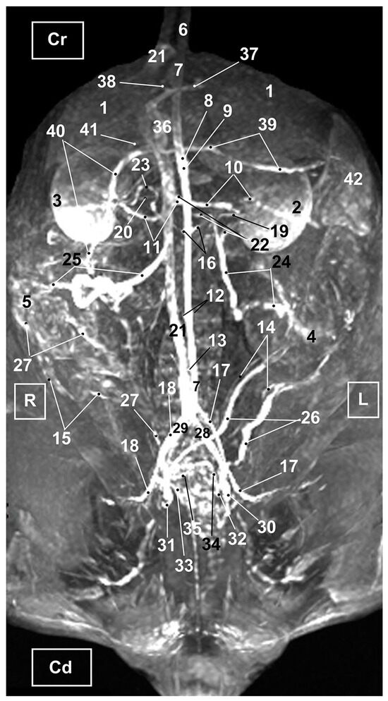 MRI TOF of the abdominal and pelvic arterial and venous system in the cat. Ventral view. R = Right side. L = Left side. Cr = Cranial. Cd = Caudal. 1. Liver; 2. left kidney; 3. right kidney; 4. left ovary; 5. right ovary 6. descending aorta: thoracic aorta; 7. abdominal aorta; 8. celiac artery; 9. cranial mesenteric artery. 10. left renal artery; 11. right renal artery; 12. right and left ovarian arteries; 13. caudal mesenteric artery; 14. left uterine artery; 15. right uterine artery; 16. right and left middle adrenal arteries; 17. left external iliac artery; 18. right external iliac artery; 19. left ureter; 20. right ureter; 21. caudal vena cava; 22. left renal vein; 23. right renal vein; 24. left ovarian vein; 25. right ovarian vein; 26. left uterine vein; 27. right uterine vein; 28. left common iliac vein; 29. right common iliac vein; 30. left external iliac vein; 31. right external iliac vein; 32. left internal iliac vein; 33. right internal iliac vein; 34. left vaginal vein; 35. right vaginal vein; 36. portal vein; 37. portal vein: left branch; 38. portal vein: right branch; 39. splenic vein; 40. cranial mesenteric vein; 41. gastroduodenal vein; and 42. spleen.