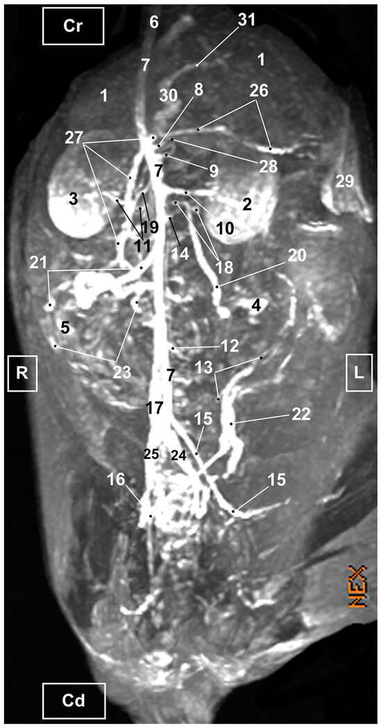 MRI TOF of the abdominal and pelvic arterial and venous system in the cat. Right oblique view. R = Right side. L = Left side. Cr = Cranial. Cd = Caudal. 1. Liver; 2. Left kidney; 3. Right kidney; 4. Left ovary; 5. Right ovary 6. Descending aorta: thoracic aorta; 7. Abdominal aorta; 8. Celiac artery; 9. Cranial mesenteric artery. 10. Left renal artery; 11. Right renal artery; 12. Caudal mesenteric artery; 13. Left uterine artery; 14. Right and left middle adrenal arteries; 15. Left external iliac artery; 16. Right external iliac artery; 17. Caudal vena cava; 18. Left renal vein; 19. Right renal vein; 20. Left ovarian vein; 21. Right ovarian vein; 22. Left uterine vein; 23. Right uterine vein; 24. Left common iliac vein; 25. Right common iliac vein; 26. Splenic vein; 27. Cranial mesenteric vein; 28. Gastroduodenal vein; 29. Spleen; 30. Portal vein; and 31. Portal vein: left branch.