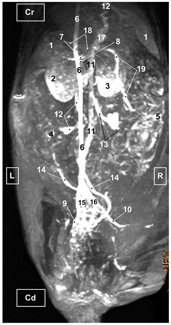 MRI TOF of the abdominal and pelvic arterial and venous system in the cat. Left oblique view. R = Right side. L = Left side. Cr = Cranial. Cd = Caudal. 1. Liver; 2. Left kidney; 3. Right kidney; 4. Left ovary; 5. Right ovary 6. Abdominal aorta; 7. Celiac artery; 8. Cranial mesenteric artery. 9. Left external iliac artery; 10. Right external iliac artery; 11. Caudal vena cava; 12. Left ovarian vein; 13. Right ovarian vein; 14. Left uterine vein; 15. Left common iliac vein; 16. Right common iliac vein; 17. Portal vein; 18. Splenic vein; 19. Cranial mesenteric vein.