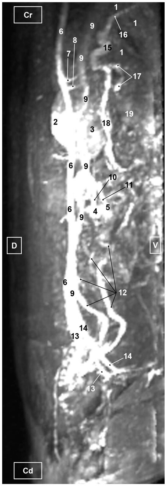 MRI TOF of the abdominal and pelvic arterial and venous system in the cat. Right lateral view. Cr=Cranial. Cd=Caudal. D=Dorsal. V=Ventral 1. Liver; 2. Left kidney; 3. Right kidney; 4. Left ovary; 5. Right ovary; 6. Abdominal aorta; 7. Celiac artery; 8. Cranial mesenteric artery; 9. Caudal vena cava; 10. Left ovarian vein; 11. Right ovarian vein; 12. Left uterine vein; 13. Left common iliac vein; 14. Right common iliac vein; 15. Portal vein; 16. Portal vein: right branch; 17. Splenic vein; 18. Cranial mesenteric vein; 19. Spleen.