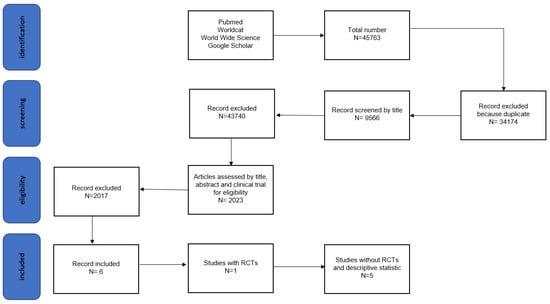 Out of the initial pool of 45,763 studies, the exclusion process led to the removal of 34,174 duplicates. Subsequently, 9566 studies underwent screening based on their titles, and 2017 studies were further scrutinized based on clinical trial criteria. Following this, the inclusion criteria were applied to the remaining studies, leaving a final selection of six articles for closer examination (as detailed in Table 2). Among these final studies, one was classified as an RCT (Randomized Controlled Trial, study 1), while the remaining five were categorized as No-RTCs (Non-Randomized Controlled Trials, studies 2–6).