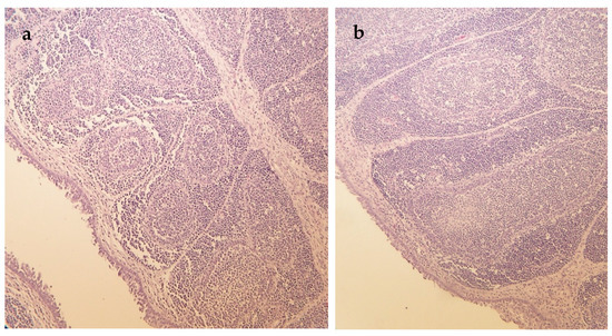 Hematoxylin and eosin-stained sections of the bursa of Fabricius of ducks (a) Bursa of Fabricius section of a duck fed mycotoxin contaminated control diet showing mildly decreased lymphocyte counts (day 14), 200× magnification; (b) Bursa of Fabricius section of a duck fed mycotoxin contaminated diet supplemented with milk thistle seed showing normal lymphocyte counts (day 14), 200× magnification.