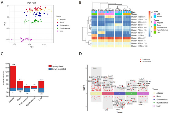 To investigate global biological alteration and systemic whole-body impacts of innate immune genes related to NEB, we obtained the transcriptome data of adipose, blood, endometrial, hypothalamus, and liver tissue from a public database of dairy cows. The reads counts matrix of expressed genes from 141 samples was transformed into a TPM (Transcripts Per Million) matrix. The TPM of innate immune genes exhibited a closed grouping of adipose, blood, and endometrial samples in principal component analysis (PCA). Liver and hypothalamus samples distinguished out from other tissues (Figure 1A). This suggested that innate immune genes in different tissues had distinct patterns.