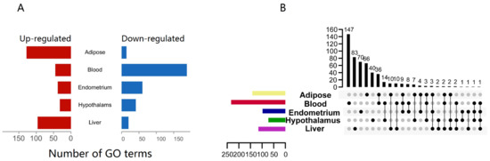 We utilized gene-set enrichment analysis (GSEA) with gene ontology (GO) biological processes to uncover NEB-impacted biological functions (BPs). We clustered GO terms with p-values below 0.05 when comparing NEB to normal in different tissues. Most pathways, 233, were enriched in the blood and mostly down-regulated, indicating that NEB inhibited blood innate immune gene activation (Figure 2A). Adipose and hepatic routes predominated over the hypothalamus and endometrial pathways. Few pathways were shared by several tissues, and most of the pathways enriched to innate immune genes were tissue-specific (Figure 2B).