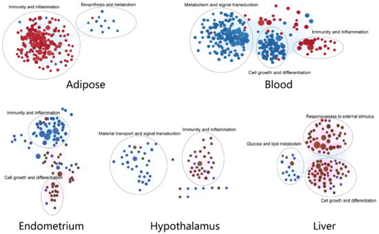 The pathways enriched in different tissues were clustered according to similarity co-efficient (Figure 3). Processes related to immune response and inflammation were significantly up-regulated in the adipose and hypothalamus but down-regulated in the endometrium, related to defense reaction were up-regulated in the blood, and related to the response to the external stimulus were up-regulated in the liver. It was seen that pathways related to defense function were generally up-regulated and influenced by NEB, except in the endometrium, where they were mainly down-regulated.