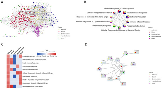 Then, using the Cytoscape ‘merge’ tool, we combined all of the networks of routes enriched from different tissues based on similarity coefficients. Overall, these pathways were grouped according to tissue specificity, indicating that innate immune gene expression patterns were tissue specific. However, there were several common defense-related pathways enriched from diverse tissues that were practically concentrated in the same location (Figure 4A). These multi-tissue common pathways established a highly linked defensive network, all of which were elevated in adipose tissue (Figure 4B,C). NEB caused excessive fat mobilization and increased inflammation in adipose tissue [20,55], as well as a change in the overall defense state. The network’s highest weighted variable was ‘Defense Response to Other Organism,’ which was significantly affected in three tissues (adipose, blood, and endometrium). This suggested that NEB modifies the host defense mechanisms against foreign substances and influences how innate immune genes are expressed. We discovered that several common processes, such as ’Cytokine Production‘, ’Defensive Response to Bacterium‘ and ’Innate Immune Response‘ were down-regulated in the endometrium, decreasing the endometrial defense capability (Figure 4C). Four of these pathways—innate immune response, reaction to bacteria, response to other organisms, and defense response to bacterium—were present in adipose, blood, and endometrial and were elevated in all three tissues while being down-regulated in the latter. We noted that an ‘Inflammatory response’ was promoted both in the adipose and hypothalamus.