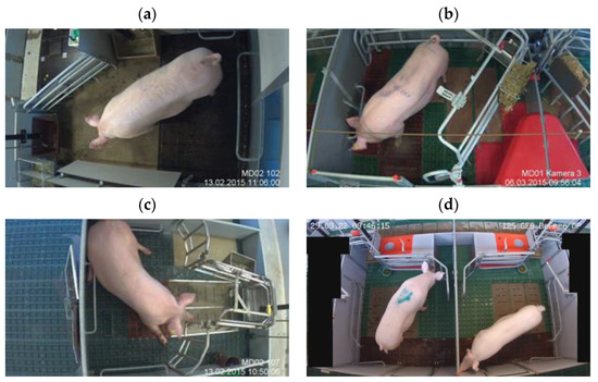 Labeled images with sows: (a) SWAP; (b) trapezoid; (c) wing; (d) BeFree (left pen under camera view is masked).