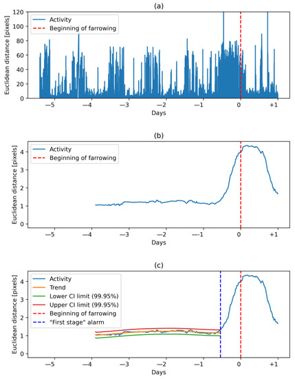 To estimate the dynamics of activity of sows, the Kalman filtering and fixed interval smoothing (KALMSMO) algorithm was used, as described in Oczak et al. [6], with the same hyper-parameter values of the model. The KALMSMO algorithm was fitted to an input variable, i.e., Euclidean distance at a fixed interval of 48 h, and expanded recursively by 15 min steps until the trend in animal activity changed to significantly increasing. The increase in activity trend was indicated by Euclidean distance reaching a higher value than the upper confidence interval of the estimated trend (Figure 4c). Then, the “first-stage” alarm was raised. The preferred time frame for the “first-stage” alarms was within 48 h before the onset of farrowing, and the alarm was not supposed to be generated after the onset of farrowing [6]. The “second-stage” was raised when the trend in animal activity changed to significantly decreasing. This was indicated by the input variable reaching a lower value than the lower confidence interval of the estimated trend. This alarm could be interpreted as an indication that nest-building behavior had ended. The preferred time frame for the “second-stage” alarm was after the “first-stage” alarm (within 48 h before the onset of farrowing) and not later than the end of farrowing [6].