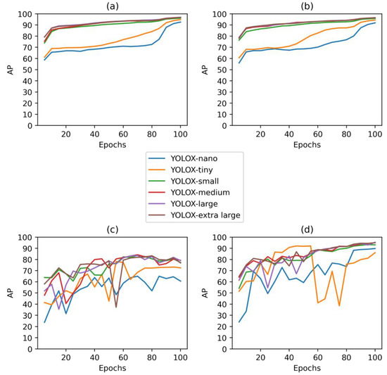 Results of both experiment 1 and 2 revealed, as could be expected, that more complex models of YOLOX (YOLOX-small, YOLOX-medium, YOLOX-large, YOLOX-extra large) had better AP in both validation sets and test sets (Figure 5). Higher AP was achieved for these models after shorter duration of training than for simpler models (YOLOX-nano, YOLOX-tiny).
