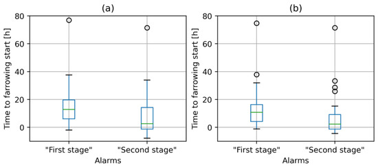 Results of farrowing prediction. Percentage of animals with (a) ”First-stage” alarms. (b) “Second-stage” alarms.