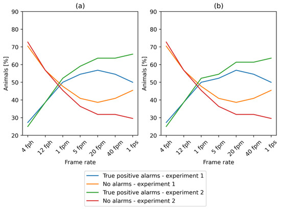 Analysis of the frame-rate impact on the performance of farrowing prediction showed that with the highest frame rate of 1 fps, we obtained the highest number of alarms for a model trained in experiment 1, with “first-stage” alarms raised for 29 animals out of 44 (66%) in the period of 48 h before the beginning of farrowing (Figure 7). With the reduction in the frame rate, the percentage of sows for which the “first and second-stage” alarms were generated in the desired time decreased to a minimum of 11 sows (25%). The results of farrowing prediction in relation to the frame rate revealed the highest number of true positive alarms for YOLOX-large trained in experiment 1 at 20 fpm, and decreased with the lower or higher frame rate. However, the lowest number of true positive alarms was achieved based on YOLOX-large detections when the frame rate decreased below 1 fpm (Figure 7).