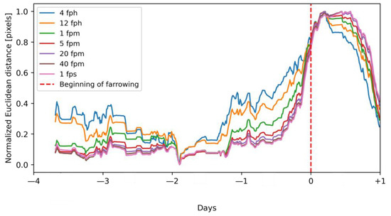 The highest number of true positive alarms was achieved with a frame rate of at least 20 fpm. With this frame rate, either the best performance was reached (model trained in experiment 1) or the performance increased only slightly with a further increase in the frame rate (model trained in experiment 1). Generally, a lower number of true positive alarms with lower frame rates of videos was related to increased variability in the calculated activity of sows. With lower frame rates, an increase in activity related to nest-building behavior and approaching farrowing became less distinguishable from normal activity patterns. This was visualized in Figure 8, in which we presented the results of the calculation of normalized Euclidean distance.