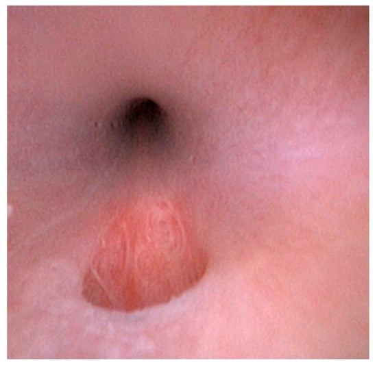 Only seven cases of urethral duplication have been described in dog to date [,,,,,,]. It was usually found in male dogs and only recently a case has been reported in a female dog []. Several anatomical variations exist, depending on the location and opening of the duplicated urethra (perineum or rectum). Urethral duplication may be complete with communication to the skin surface, or may be incomplete and end blindly []. Based on anatomical variations, it may show several different clinical manifestations (intermittent stranguria, pollakiuria, haematuria, incontinence, urine dribbling from anus or perineum, and obstructive urolithiasis, sometimes with a concurrent urinary tract infection or secondary dermatitis by urine-induced burns), but in dogs, it can be asymptomatic, without pain manifestation or urination difficulty, as in the present case. According to Stedile et al. [], the Y duplication is unusual when the orthotopic urethra is normal. Because of the close association between embryonic development of the urogenital and gastrointestinal systems, urethral duplication is almost always accompanied by other duplication anomalies [,]. These anomalies result from an abnormal sagittal midline division, and subsequent parallel development of the embryonic hindgut, cloaca, rectum, or urogenital sinus []. In the present case, cystourethroscopy confirmed the radiographic findings of a second canal arising from the first, and according to the classification described by Effmann et al. [], the urethral duplication was of type IIA2, and no other anomalies were highlighted. The differential diagnosis should be made with a urethroperineal fistulae opening adjacent to the anal sphincter, urethrorectal fistula, a rare congenital or acquired condition in dogs with connected lumens of the urethra and the rectum, and recurrent urinary lithiasis []. The distinction between urethral fistulas and urethral duplication occurs on the basis of histological findings. The fistula is defined as a structure lined with squamous epithelium, and a truly duplicated urethra is defined as a structure lined with transitional epithelium [,], as in the present case.