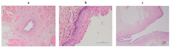 The patient was positioned in a sternal decubitus. After a trichotomy of the perianal region and the ventral portion of the abdomen, a purse string suture was performed on the anus. A 2.6-mm urethral catheter was placed in the orthotopic urethra and connected with a closed system to a urine collection bag. Subsequently the perineal ostium of the abnormal urethral tract was catheterized with a 1.3-mm, semi-rigid, urinary catheter. The abnormal urethral tract was delicately isolated, then its resection was performed. The excised portion was sent to the pathological anatomy laboratory for histological examination (Figure 4a–c), which showed that the urethral lumen was lined by transitional epithelium and lamina propria being characterized by a fibro vascular stroma. Two months after surgery, the dog was in good health and urinated normally.