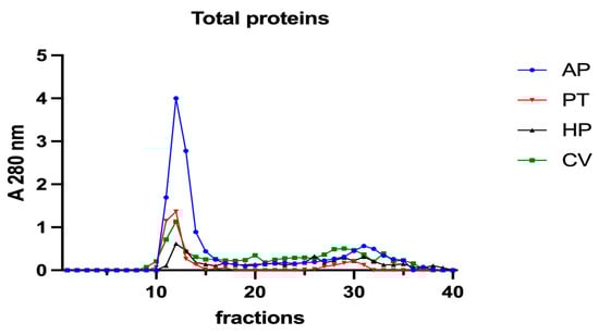 Chromatographic profiles of total proteins after SEC of extracts from algal samples. Proteins were detected at 280 nm. Each chromatographic profile is the mean of two chromatographies. AP = A. platensis; PT = P. tricornutum; HP = H. pluvialis; CV = C. vulgaris.