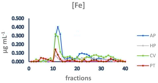 Chromatographic profiles of iron after SEC of extracts from algal samples. Iron concentration is expressed as µg mL−1. Each chromatographic profile is the mean of two chromatographies. AP = A. platensis; PT = P. tricornutum; HP = H. pluvialis; CV = C. vulgaris.