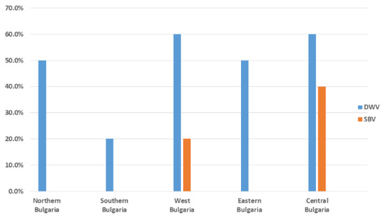 Pollen samples were collected from a total of 14 different regions in Bulgaria in order to provide more comprehensive information about the epizootic situation (Figure 1). We were able to detect only DWV and SBV in each of the three studied pollen types (from trade markets, directly provided by beekeepers, and bee bread). DWV was observed with the highest frequency among all samples (12/25, 48%). SBV was found with a significantly lower frequency (3/25, 25%). As determined by all investigated samples, no viruses were observed in seven different regions (7/14, 50%). Significant regional differences in the distribution patterns of the investigated viruses could be observed (Figure 2). DWV was observed with the highest frequency (60%) in Central and West Bulgaria, while in the southern regions of the country it was established with a much lower frequency (20%). The SBV virus showed a similar way of spreading. This virus was detected with the highest frequency in Central Bulgaria (40%), followed by West Bulgaria (20%). In the northern, southern, and eastern parts of the country, there was no presence of SBV. The highest rate of co-infection, i.e., simultaneous detection of DWV and SBV, was found in the central part of the country (Figure 2). These results practically showed that every studied sample from this part of the country contained both viruses. Another region of co-infection was the Sofia region, but unlike Central Bulgaria, samples with DWV presence were only observed here.