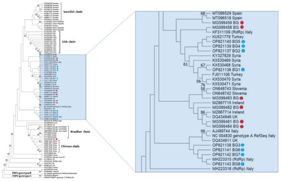Phylogeny of deformed wing virus (DWV) isolates from Bulgaria and other countries. The unrooted phylogenetic tree was constructed based on the alignment of parts of nonstructural protein gene sequences of DWV isolates (382 bp) (nucleotide positions 8566–8960 bp according to RefSeq Acc. no. NC_004830) from Bulgaria using the neighbor-joining method under the maximum composite likelihood model. The indicated branching topology was evaluated by bootstrap resampling of the sequences 10,000 times, and nodes supported by bootstrap values > 50 are shown. Each isolate is indicated by the country of isolation and GenBank accession number. Bulgarian isolates identified by this study are shown in blue and red (the isolates from honey bees) [48].