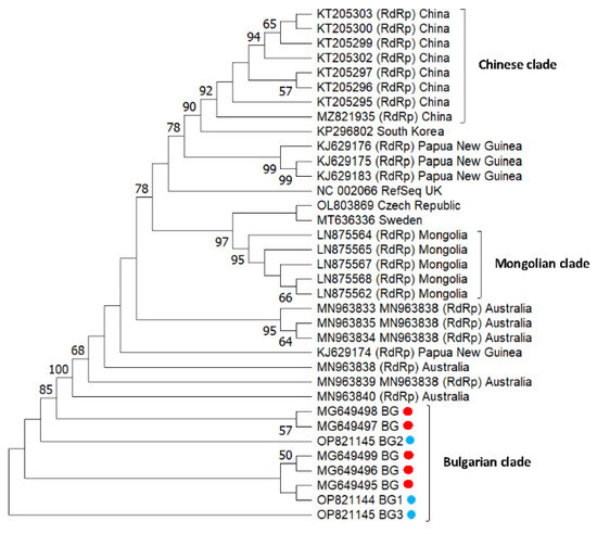Phylogeny of sacbrood virus (SBV) isolates from Bulgaria and other countries. The unrooted phylogenetic tree was constructed based on the alignment of the part of nonstructural protein gene sequences of SBV isolates (382 bp) (nucleotide position 7747–8172 bp according to RefSeq Acc. No. NC_002066) from Bulgaria using the neighbor-joining method under the maximum composite likelihood model. The indicated branching topology was evaluated by bootstrap resampling of the sequences 10,000 times, and nodes supported by bootstrap values > 50 are shown. Each isolate is indicated by the country of isolation and GenBank accession number. Bulgarian isolates identified by this study are shown in blue and red (the isolates from honey bees) [48].
