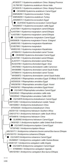 - Okely, M.; Anan, R.; Gad-Allah, S.; Samy, A. Hard ticks (Acari: Ixodidae) infesting domestic animals in Egypt: Diagnostic characters and a Taxonomic key to the collected species. Med. Vet. Entomol. 2021, 35, 333–351. [Google Scholar] [CrossRef]