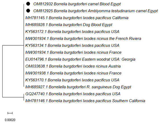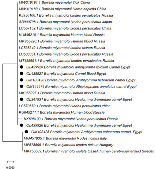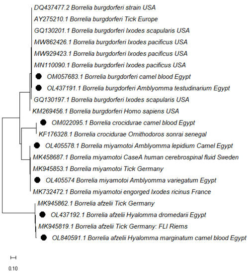 Ashour, R.; Hamza, D.; Kadry, M.; Sabry, M.A. The Surveillance of Borrelia Species in Camelus dromedarius and Associated Ticks: The First Detection of Borrelia miyamotoi in Egypt. Vet. Sci. 2023, 10, 141. https://doi.org/10.3390/vetsci10020141