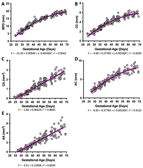 - Turner, A.J.; Trudinger, B.J. Ultrasound Measurement of Biparietal Diameter and Umbilical Artery Blood Flow in the Normal Fetal Guinea Pig. Comp. Med. 2000, 50, 6. [Google Scholar]