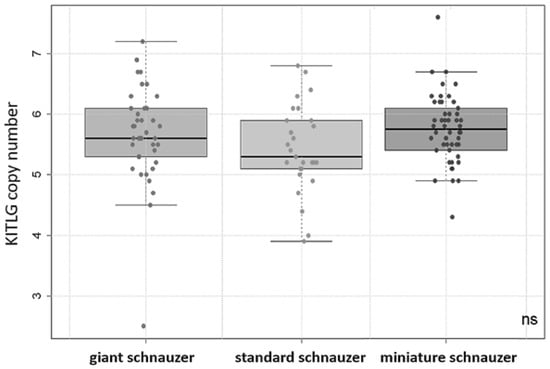 Boxplot: copy number values of KITLG in the giant (n = 39), standard (n = 27), and miniature (n = 50) schnauzer groups (including dogs with and without digital squamous cell carcinomas or unknown health status). There were no significant (ns) differences in the mean values between any of the breeds observed.