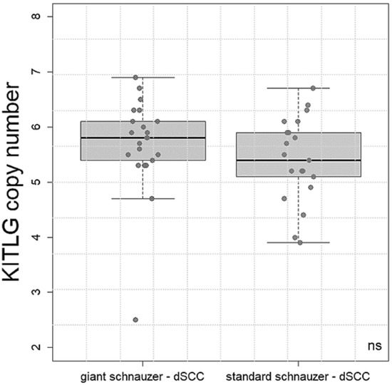 Boxplot: copy number values of KITLG in the giant (n = 22) and standard (n = 18) schnauzers with digital squamous cell carcinoma (dSCC). There was no significant (ns) difference in the mean values between the breeds.