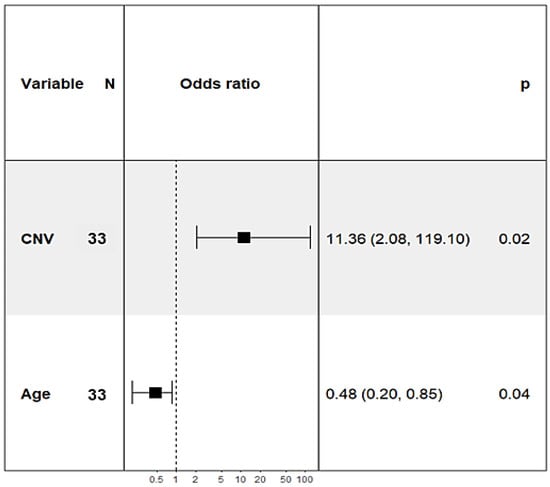 Forest plot: odds ratios of copy numbers of the KITLG locus and age varying significantly between the giant schnauzers with (n = 22) and without (n = 11) squamous cell carcinoma of the digit.