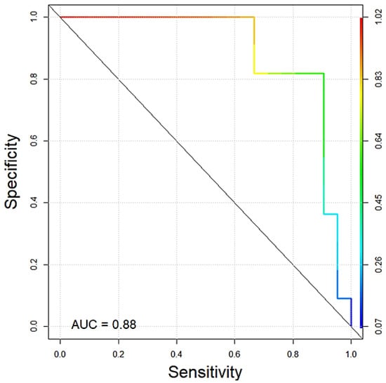 ROC curve showing the quality of copy number testing of the KITLG locus in black giant schnauzers with (n = 22) and without (n = 11) digital SSC of our cohort. The AUC value was 0.88.