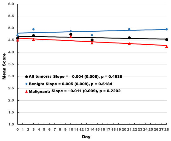 Dogs with benign tumors had consistently better stool quality scores than dogs with malignant tumors (Figure 1). Stool quality scores increased slightly over time for dogs with benign tumors and decreased slightly over time for the overall population and dogs with malignant tumors. However, none of the changes were statistically significant and consistently remained above 4 on a 5-point scale.