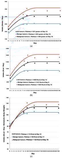 Responses over time for intake, pet owner food evaluation questionnaire, pet quality of life assessments, and stool scores were modeled using linear and non-linear regression methods. All regression models were fit both pooled over tumor type and separately for each tumor type. Intake (grams and calories) was modeled using a quadratic-plateau model using PROC NLIN in SAS®, version 9.4 (SAS Institute, Cary, NC, USA; https://www.sas.com/en_us/home.html, accessed on 26 July 2022). Initial intercept and linear and quadratic slope values for the non-linear estimation procedure were determined by fitting a quadratic polynomial to the data using PROC GLIMMIX in SAS®, version 9.4 (SAS Institute, Cary, NC, USA; https://www.sas.com/en_us/home.html accessed on 26 July 2022).