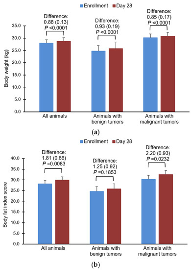 Body weight and body fat index data were collected at enrollment and day 28 only. These data were analyzed using a paired t test to determine whether the difference between the two time points was significantly different from 0. The t tests were performed both pooled over tumor type and separately for each tumor type. Summary statistics for the responses from the veterinarian exit survey, pet owner exit survey, and demographic characteristics were calculated using PROC MEANS in SAS®, version 9.4. (SAS Institute, Cary, NC, USA; https://www.sas.com/en_us/home.html accessed on 26 July 2022).