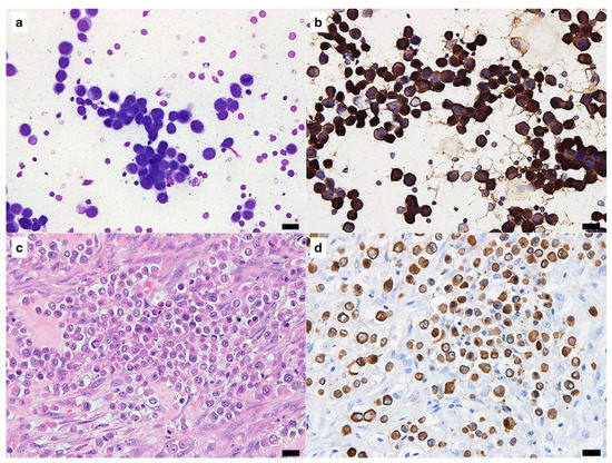 - Raskin, R.E.; Vickers, J.; Ward, J.G.; Toland, A.; Torrance, A.G. Optimized Immunocytochemistry Using Leukocyte and Tissue Markers on Romanowsky-Stained Slides from Dogs and Cats. Vet. Clin. Pathol. 2019, 48, 88–97. [Google Scholar] [CrossRef] [PubMed]