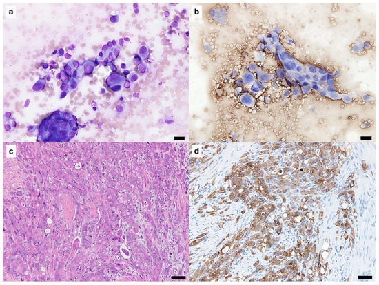A sample diagnosed as undifferentiated carcinoma of the mammary gland was stored at −30 °C for 46 months. (a) Standard Giemsa stain. (b) Detection of cytokeratin by immunocytochemistry (ICC). (c) Standard hematoxylin and eosin stain. (d) Detection of cytokeratin detection by immunohistochemistry (IHC). Positive signals for cytokeratin in the tumor cells were observed in both the ICC and IHC samples. In the ICC and IHC panels: 3,3′-diaminobenzidine (DAB) chromogen, hematoxylin counterstain. Scale bars = 20 μm.