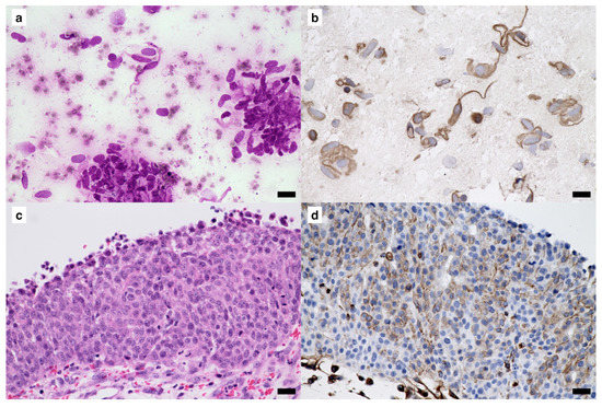 A sample diagnosed as transitional cell carcinoma of the urethra was stored at −30 °C for 56 months. (a) Standard Giemsa stain. (b) Detection of cytokeratin by immunocytochemistry (ICC). (c) Standard hematoxylin and eosin stain. (d) Detection of cytokeratin by immunohistochemistry (IHC). Positive signals for cytokeratin in the tumor cells were observed in samples stained using IHC but not in those stained using ICC. In the ICC and IHC panels: 3,3′-diaminobenzidine (DAB) chromogen, hematoxylin counterstain. Scale bars = 20 μm.
