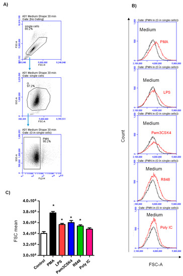 The change in cell size was determined by flow cytometric measurement of alterations in the forward light scatter (FSC) value of the neutrophils (Accuri C6 flow cytometer; BD Biosciences), as described previously [23]. Neutrophils in 100 µL HBSS medium (1 × 106 cells) were incubated for 30 min at 37 °C and 5% CO2 with 1 μg/mL of LPS, 1 μg/mL of Pam3CSK4, 0.2 µg/mL of R848, 10 µg/mL of Poly IC, or 10 ng/mL of PMA. Mean FSC values for stimulated neutrophils were compared with mean FSC values of non-stimulated cells in the medium control (cells in HBSS medium without stimulation). Overlapping histograms were generated using the C flow software (BD Biosciences) to make graphical comparisons.